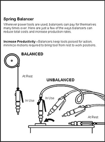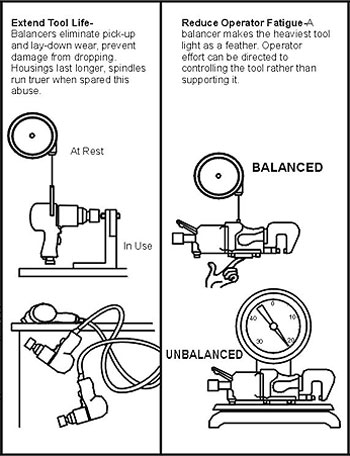 Для максимальной эффективности и долговечности эксплуатации, Балансир должен быть закреплен непосредственно над рабочим местом, и перпендикулярно полу. При постоянной необходимости перемещения балансира с инструментом с одного места на другое, нужно использовать подвесные передвижные блоки.
