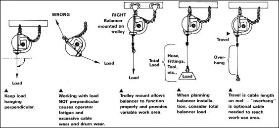 Для максимальной эффективности и долговечности эксплуатации, Балансир должен быть закреплен непосредственно над рабочим местом, и перпендикулярно полу. При постоянной необходимости перемещения балансира с инструментом с одного места на другое, нужно использовать подвесные передвижные блоки.